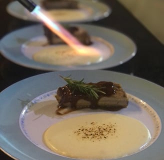 Criamos experiências memoráveis com pratos elaborados, focando na sofisticação e na qualidade dos ingredientes.